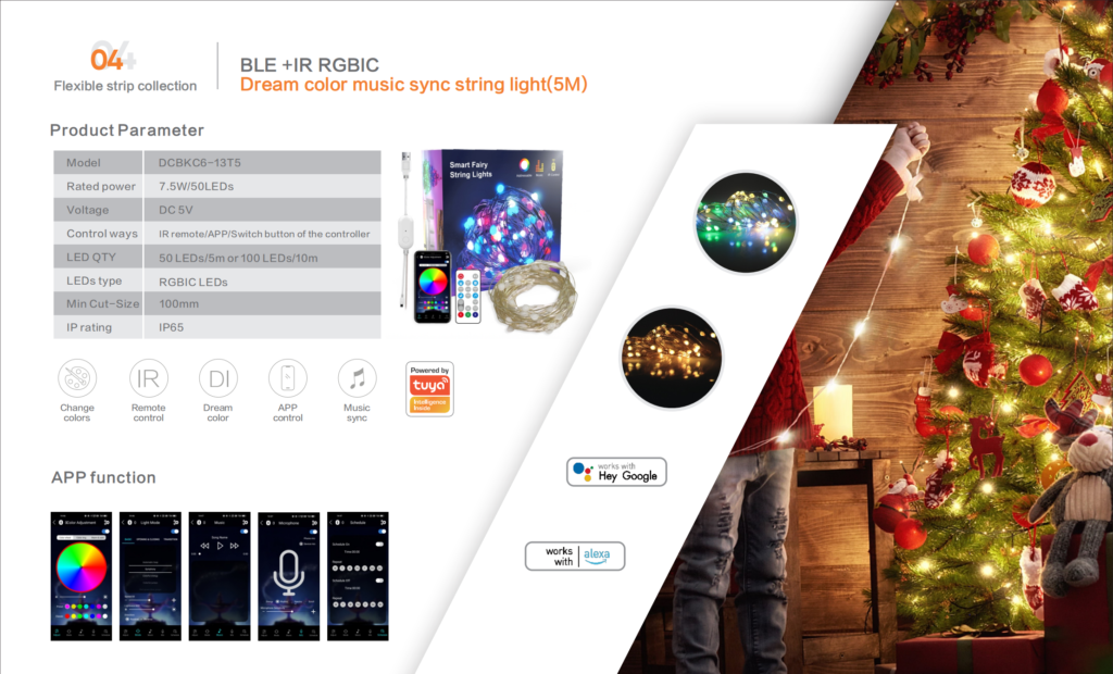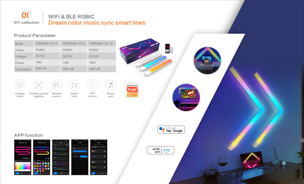 We mainly produce LED strip light, LED strip light kit with IR/RF/BLE/TUYA control and smart ambient light series. We also provide related accessories such as LED aluminum profiles, LED controllers, power supplies and connectors.